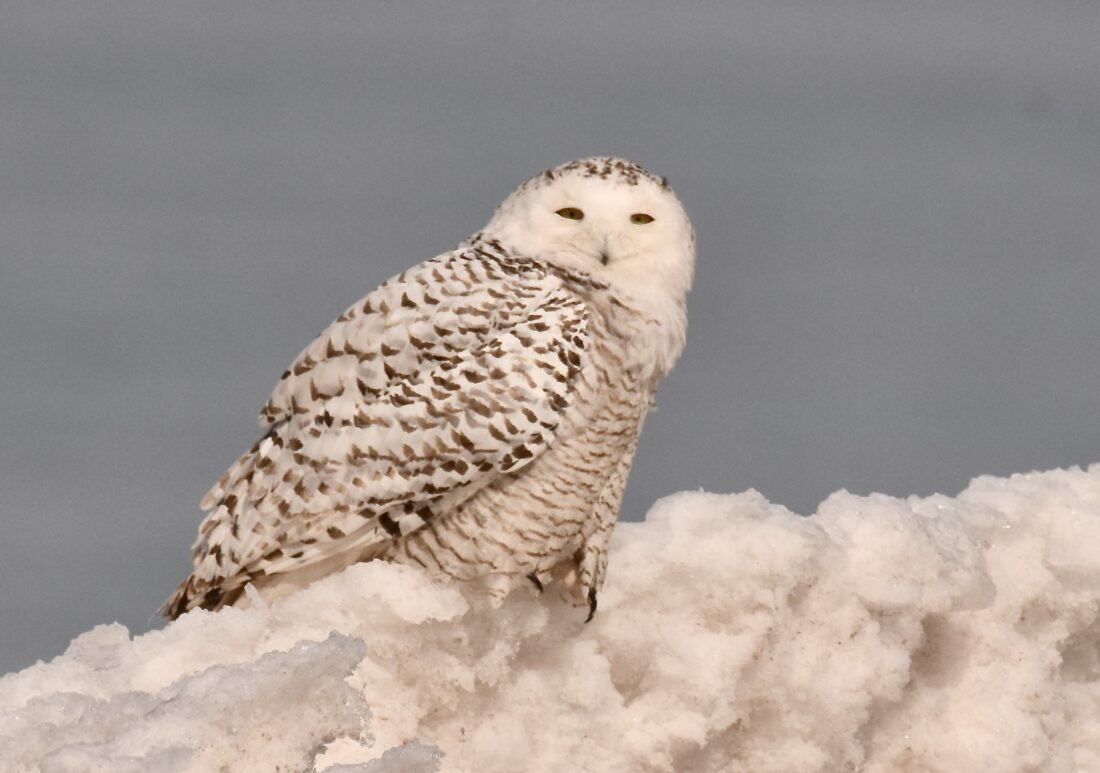 A snowy owl finally made it officially to Marquette last week! While there have been a number of them in the eastern Upper Peninsula this winter, there had been none reported in the local area this winter. One did turn up last Saturday morning on the ice just north of Picnic Rocks. Originally it was found sitting on an ice about 120 feet off shore, eventually flew three different times, closer to and eventually onto one of the Picnic Rocks. It stopped twice on floating ice, putting up gulls into a swirling cloud each time. Some herring gulls dived on the owl, causing it to splash once in the water. There was another report of a snowy owl near the lake shore several days earlier so it may have already been in the area for several days. Because of the large amount of ice along the shore and the bird’s color, it does blend in well.