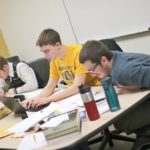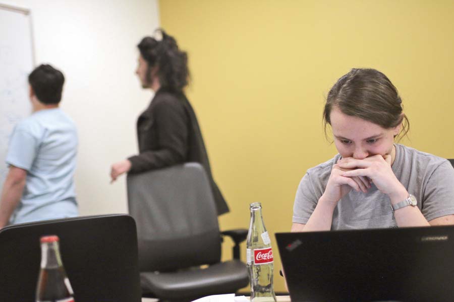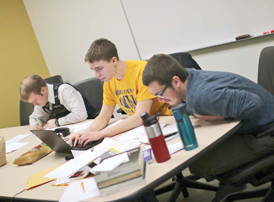 From left, Micah Argeropoulos, Matt Trefilek and Ben Harris, computer science majors at NMU, work together to solve coding problems. Michigan Tech University won first place, NMU came in second and Algoma University was third. Other schools involved were Lake Superior State University, University of Wisconsin-Green Bay and the Copper County Coders high school club. (Journal photo by Rachel Oakley)