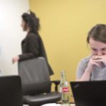 Northern Michigan University hosted its annual Invitational Programming Contest at Jamrich Hall in Marquette recently. Britney Rese, right, studies information on her computer as teammates Erik Flinn, left, and Charlie Mogan, center, work through a problem on the white board during the competition. (Journal photo by Rachel Oakley)