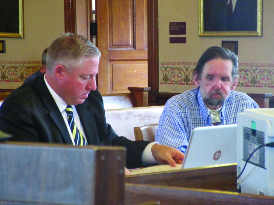 Alfred Saario, right, confers with defense attorney Henry McRoberts before jury selection Monday for his murder trial in Iron County Trial Court. (Nikki Younk/Daily News photo)