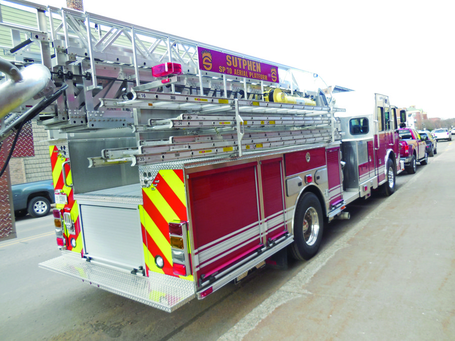 A demonstration model of the Sutphen aerial platform fire truck is parked in front of Ishpeming City Hall prior to a past Ishpeming City Council meeting. The commission unanimously approved a resolution Wednesday to authorize the sale of general obligation tax bonds for the purchase of a new fire truck. (Journal photo by Lisa Bowers)