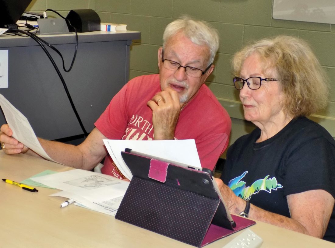 Jim and Norma Matteson take part in an interactive activity during the program entitled “Immigration Prejudice: How Much Is It Recycled?” Friday at the Beaumier U.P. Heritage Center at Northern Michigan University. (Journal photo by Christie Bleck)