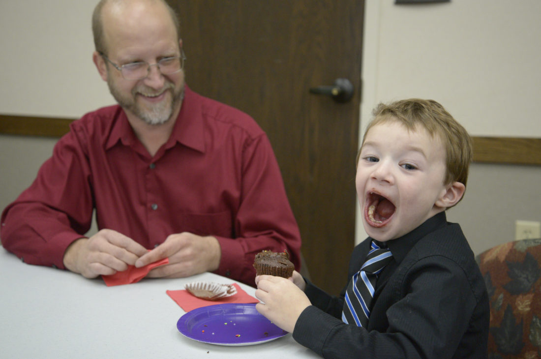 Trevin Taylor, 5, enjoys a chocolate cupcake with family friend Todd Foote. Taylor was adopted Tuesday by his grandmother, Letitia Cipriano. In celebration for National Adoption Day, a special event was held for foster and adoptive families in the community room of the Peter White Public Library Tuesday afternoon. Four adoptions were finalized earlier that day by Marquette County Probate Judge Cheryl Hill. Child and Family Services and U.P. Family Solutions hosted the event, which included a LEGOS station, free books and sweet treats. Hill also read a children’s story to the kids. An information table was provided about local adoption agencies. “The day went fantastic. Any day you can create a forever family is a wonderful day in Marquette County,” Hill said. For more information about adoptions in Michigan, visit mare.org. (Journal photo by Corey Kelly)