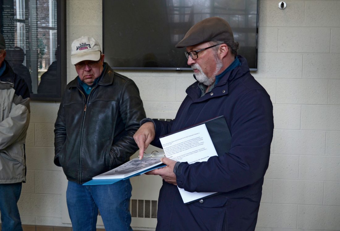 - Beaumier U.P. Heritage Center Director Dan Truckey shows event attendees photos of buildings that previously rested on NMU’s campus such as Kaye, Carey and Longyear halls. (Journal photo by Trinity Carey)
