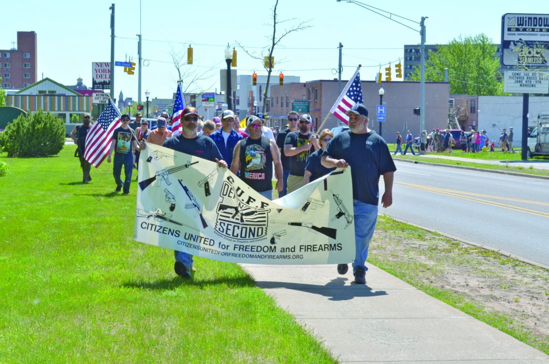 Attendees of the second annual March for Our Rights Rally, sponsored by Citizens United for Freedom and Firearms and Beauchamp Plumbing and Heating, return to Harlow Park in Marquette after marching to show their support of the Second Amendment. “Our mission is to get the education and awareness to the people and young ones who don’t know about firearms and see them as scary, and we want to show them they’re not a scary thing,” said CUFF President Bob Fassbender. “We want to show youth the proper handling and discharge of firearms so accidents can be limited, because accidents happen and I’m not going to pretend they don’t, but if we can limit them we can prove a gun is just another tool in a tool box.” (Journal photo by Trinity Carey)