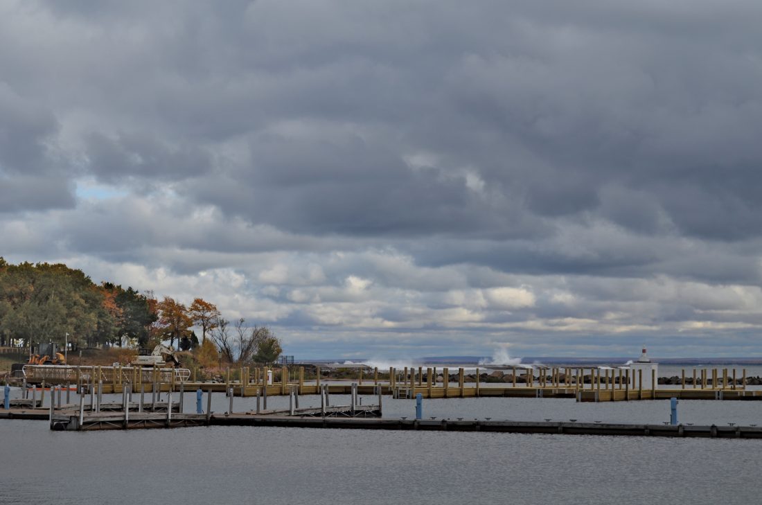 The Presque Isle Marina is pictured while waves crash over Marquette’s Upper Harbor breakwater on Wednesday. Construction at the marina began in early September and is well underway, with completion anticipated this fall. The $1.4 million project includes removal of the south pier and its fuel system, installation of floating piers, dredging mobilization, erosion control and more. (Journal photo by Cecilia Brown)