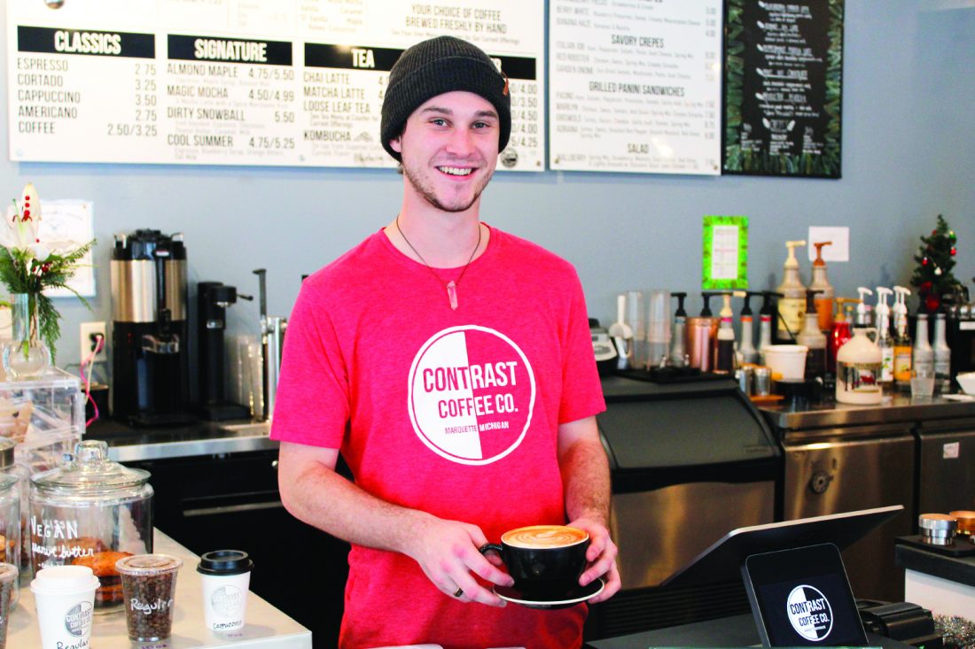 Grant Daignault, a barista at Contrast Coffee in Marquette, serves a blackberry cobbler latte. For every blackberry cobbler latte bought on Friday, Contrast Coffee will donate 10% of the profits to the Marquette Women’s Center. (Journal photo by Trinity Carey)