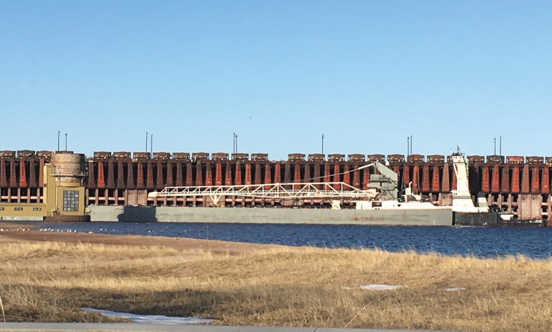 The Maumee is pictured at the LS&I ore dock in Marquette Friday evening. It’s the first freighter to arrive in Marquette after the Soo Locks reopened Wednesday. (Journal photo by Cecilia Brown)