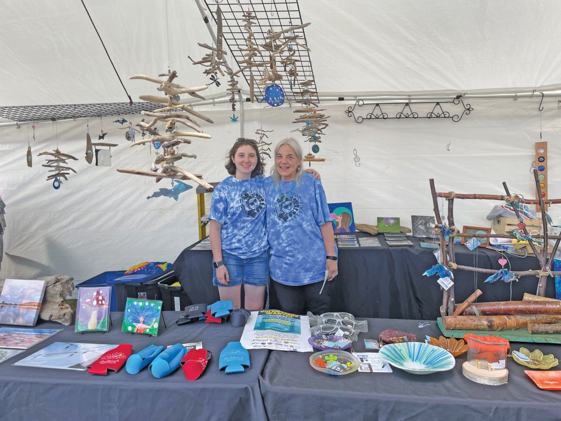 Outback Art Fair volunteer Haile Engle, left, stands with her grandmother, Cindy Engle, Outback Art Fair director of operations, at a booth featuring artwork, Outback Art Fair T-shirts, and more on Sunday. (Journal photo by Katie Segula)