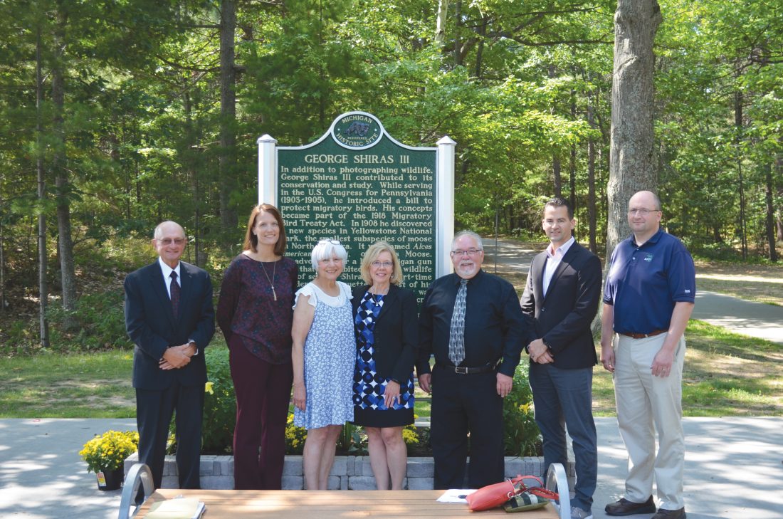 Shiras Institute board members Ward Rantala, Jim Reevs, Laura Katers Reilly, Andrew Wallner and Cheryl Hill, along with retired Northern Michigan University professor and project leader Diane Kordich, Michigan Historical Commission board member Tom Truscott, and city officials, attended the dedication and unveiling of the sign.