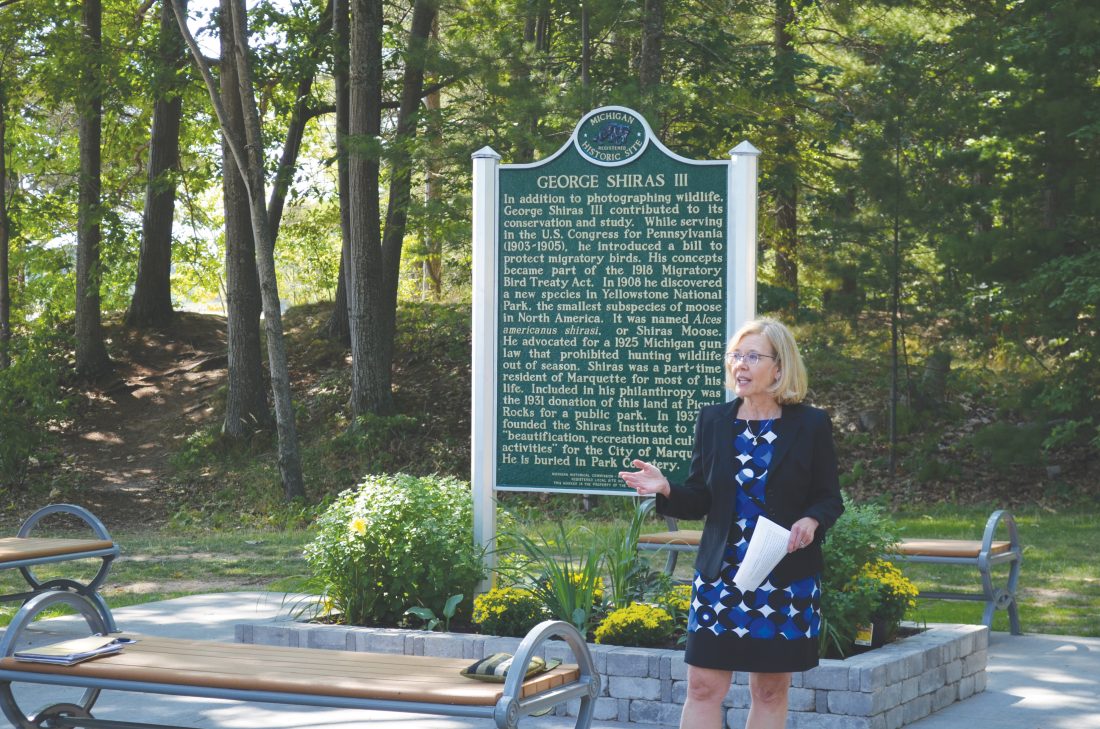 Shiras Institute Board member and Marquette County Probate Judge Cheryl Hill speaks at a dedication for a historical marker in honor of George Shiras III on Monday afternoon. The sign honoring Shiras was officially dedicated at Shiras Park. The sign recognizes the park as a registered Michigan historic site. (Journal photo by Ryan Spitza)