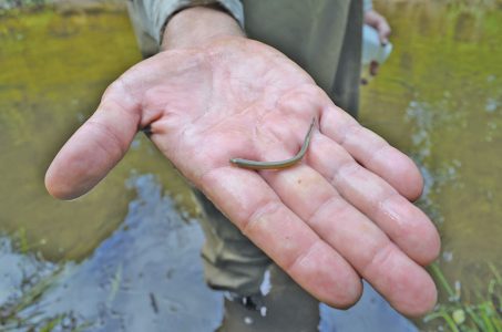 - A larval sea lamprey from Bismark Creek is held by U.S. Fish and Wildlife service biological science technician Kevin Hensiak. A crew administered lampricide to Bismark Creek — which is located near Harlow Lake off of County Road 550 — in 2019. This is one of many Great Lakes tributaries the U.S. Fish and Wildlife Service treated with lampricide in 2019 in an effort to remove the lampreys at their larval stage and reduce the adult population that will eventually reach the Great Lakes and harm fish. Tributaries with infestations are typically treated every three to five years due to the lamprey life cycle. (Journal file photo)