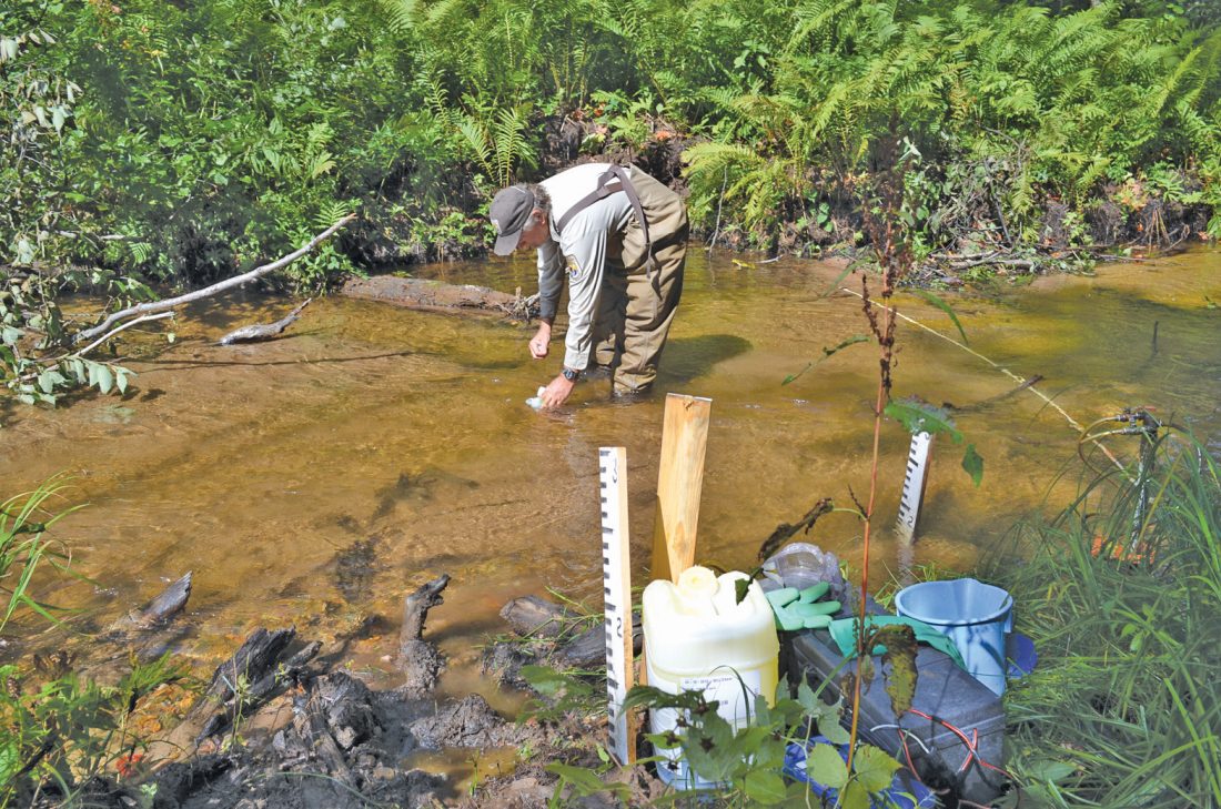 - U.S. Fish and Wildlife Service biological science technician Kevin Hensiak takes a water sample during a 2019 lampricide treatment of Bismark Creek, which is located near Harlow Lake off of County Road 550 in Marquette County. The crew administered lampricide and continually monitored concentrations in the creek for two 12-hour periods over two days. This work is key to protecting the Great Lakes fisheries, U.S. Fish and Wildlife Service officials said, as lampreys have no natural predators in the Great Lakes and each can destroy up to 40 pounds of fish over their adult life. Scientists are now researching use of the 3kPZS pheromone, a chemical released by males to guide females for mating, to determine if it can be used to lure invasive lampreys into traps. (Journal file photo)