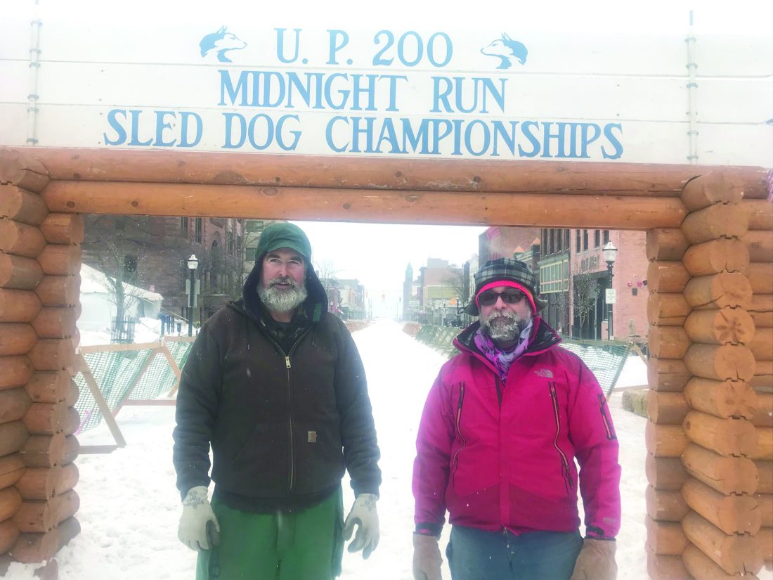 Rob Hemmer, left, and Benjamin Platt stand at the start of this year’s UP200 and Midnight Run. Hemmer and Platt, along with other individuals, volunteer their time so the event goes smoothly. (Journal photo by Christie Mastric