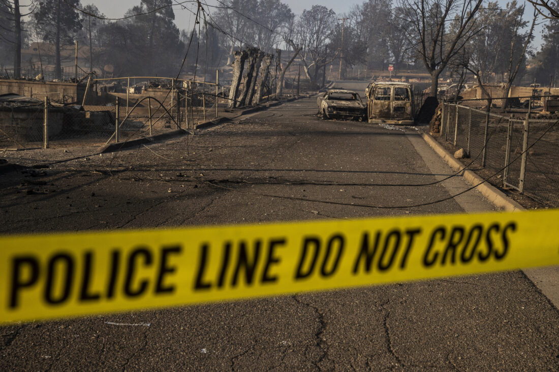 A police cordon is seen across a road in the Lincoln Heights neighborhood during the Mill Fire in Weed, Calif., Saturday. A wood products company said Wednesday that it is investigating whether a fire that killed two people as it swept through a Northern California town was caused by the possible failure of a water-spraying machine used to cool ash at its veneer mill. (AP file photo)
