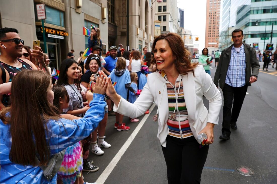 Gov. Gretchen Whitmer high -fives a young spectator during the Motor City Pride parade on Sunday in Detroit. Whitmer signed an executive order establishing Michigan’s first LGBTQ+ Commission. (Courtesy photo)