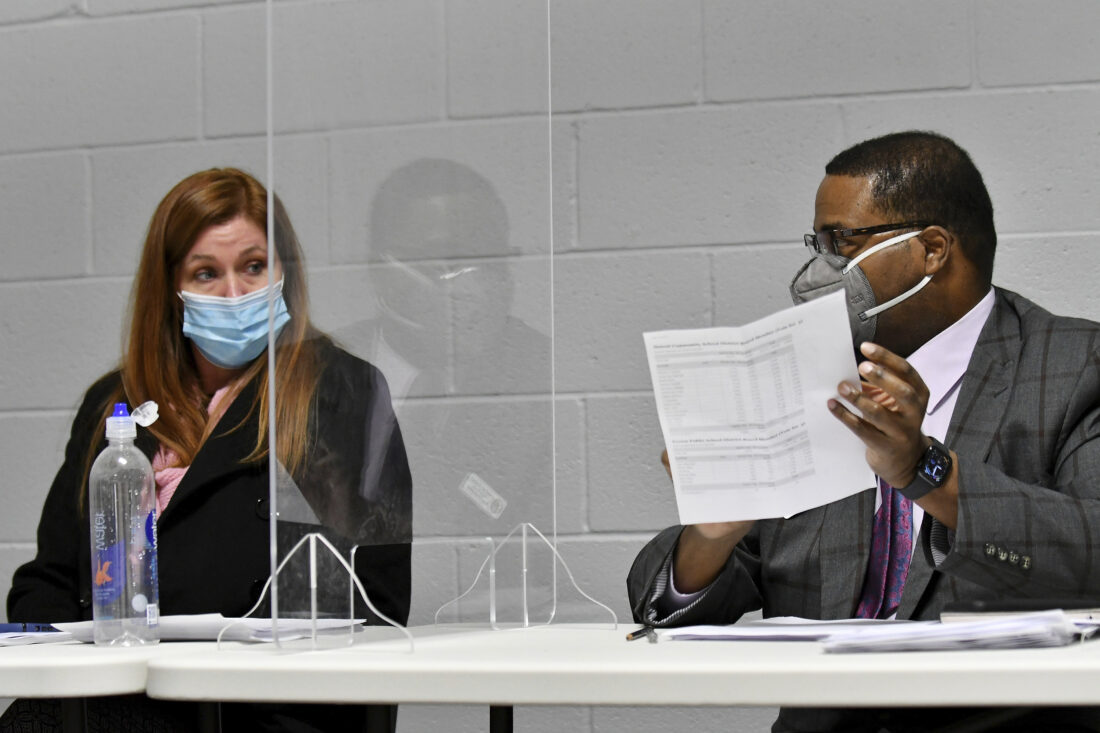 Wayne County Board of Canvassers Republican chairperson Monica Palmer, left, and Democratic vice chair Jonathan Kinloch discuss a motion to certify the election during a board meeting in Detroit on Nov. 17, 2020. A ghost from recent election cycles, controversies over certification of results are beginning to re-emerge as the nation heads closer to the 2024 presidential contest. (Robin Buckson/Detroit News via AP)