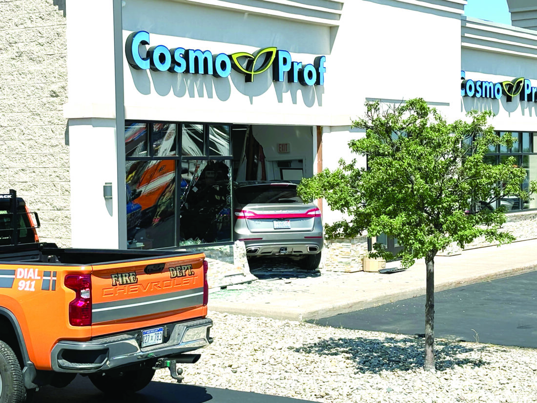 The crash site in Marquette Township is seen from the outside, clearly showing the vehicle inside the store’s front window. (Photo courtesy of Tony Troutman)