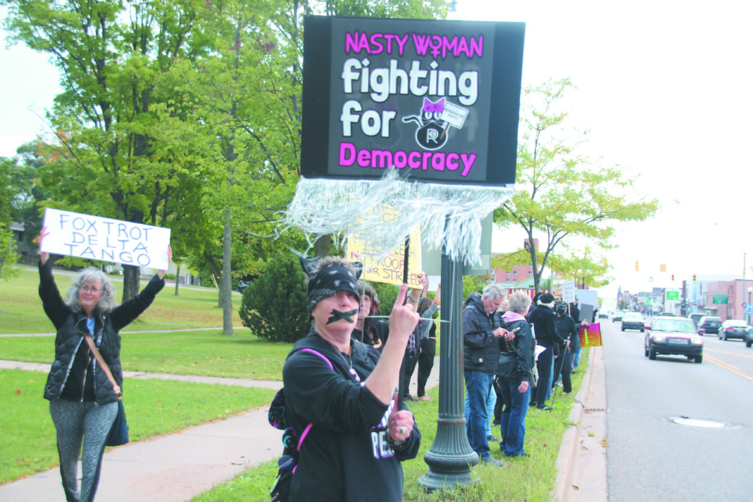 Protesters wear black and hold signs promoting free speech during a protest along West Washington Street in Marquette on Saturday. (Journal photos by Justin Marietti)