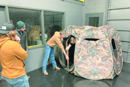 A conservation law enforcement student pulls a hunter out from his blind as part of a class scenario. Mock crime scenes are run in the school’s Public Safety Institute training room. (Photo courtesy of Jeremy Sergey)