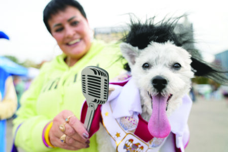 Michelle Dixon, of Laingsburg, holds her dog Abu, who is dressed as singer Elvis Presley, during an event for dog trick-or-treating on Friday in Lansing. (AP photo)