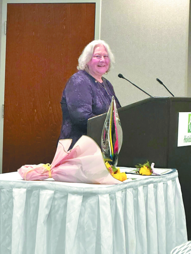 Pam Christensen accepting the Evergreen Award, Monday. (Photo courtesy of the Marquette Harbor Rotary)