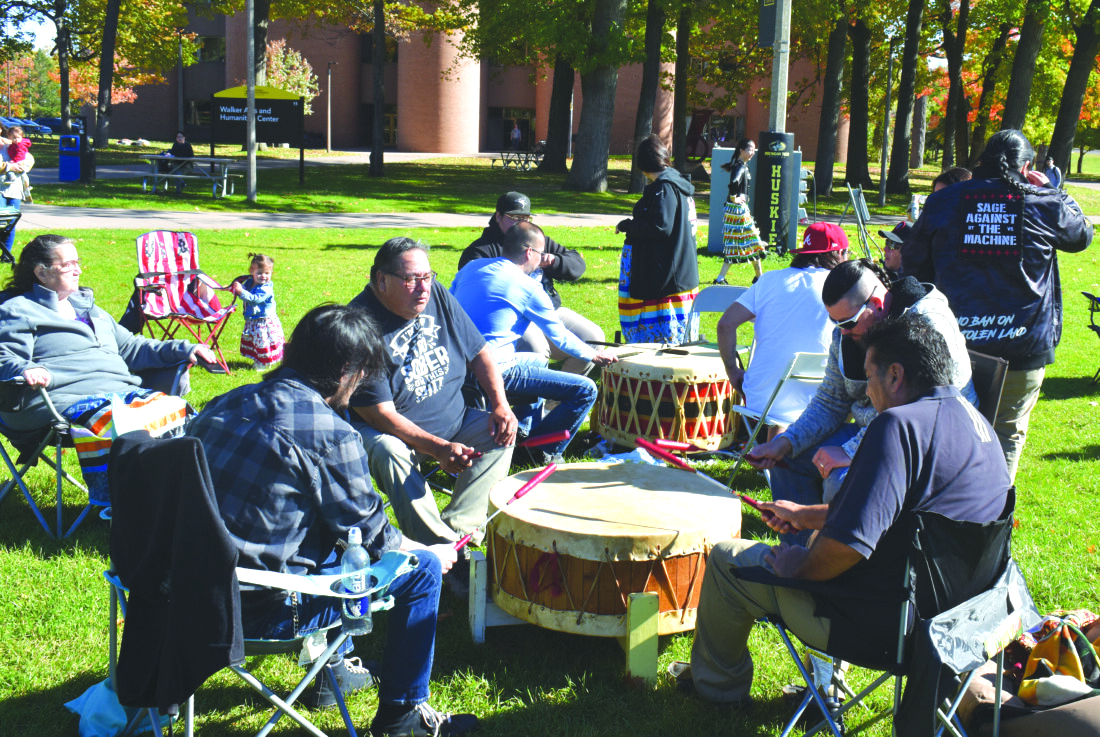 Four Thunders, one of the Drum Circles who offered prayers to the Creator in observance of Indigenous Peoples Day Monday on Walker Lawn on the Michigan Tech campus. (Houghton Daily Mining Gazette photo)