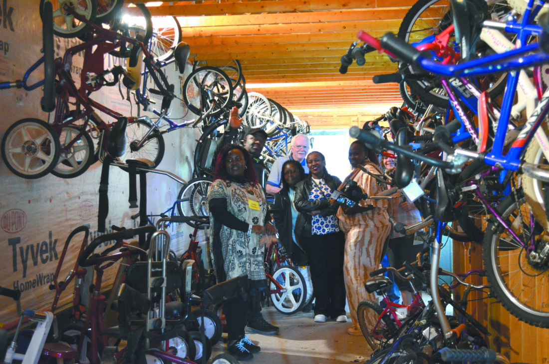 - Linda Njoolay, Pastor Joseph Mlaki, Janet Mwambona, Gloria Mushi, Janeth Laizer and Mary Lou Flearl pose for a picture while Dr. Coyne shows the group Bay Cliff’s bicycle collection. (Journal photo by Abby LaForest)