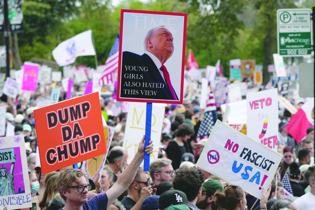 - People hold signs and flags during a “No Kings” protest on Saturday in Chicago. (AP photo)