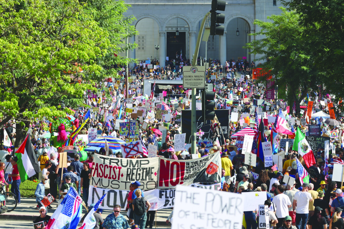 - Protesters march in the streets near City Hall during a “No Kings” protest on Saturday in Los Angeles. (AP photo)