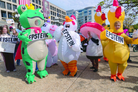 - Demonstrators in inflatable costumes rally on Pennsylvania Avenue during a No Kings protest in Washington on Saturday. (AP photo)