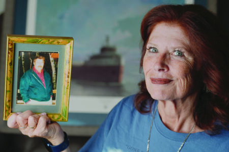 - Deb Felder holds up a picture on Oct. 20 of her father who died on the Edmund Fitzgerald in her home in Nashotah, Wis. (AP photo)