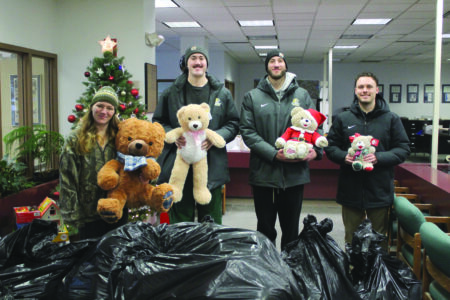 Members of the Student-Athlete Advisory Committee from Northern Michigan University donate 386 teddy bears to The Mining Journal Cheer Club from the Teddy Bear Toss event on Friday. The Mining Journal is still accepting donations for its annual Cheer Club and is looking to donate a record number of presents to children and teens in need this year. Donations to the Cheer Club can be brought to The Mining Journal office, located at 249 W. Washington St. in Marquette, from 8 a.m. through 5 p.m. Monday through Friday. (Journal photo by Antonio Anderson)