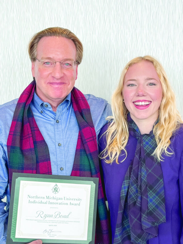 Ryan Bond, left, with a Northern Michigan University Innovation Award, standing alongside May 2025 graduate Lindsey Locke. He introduced her to the Congress-Bundestag Youth Exchange for Young Professionals program and, with the help of his mentorship, she was one of 65 Americans selected to study and work in Germany for a year. (Photo courtesy of NMU)