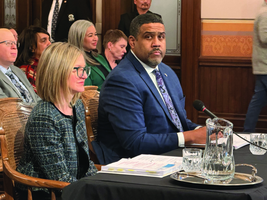 State Budget Director Jen Flood, left, and Michigan Department of Technology, Management and Budget Acting Director Kyle Guerrant, provided an overview of Gov. Gretchen Whitmer’s final budget proposal of her term, totaling roughly $88 billion. (Photo courtesy of Jordyn Hermani/Bridge Michigan)