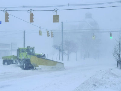 - A plow turns onto Washington Street on Monday. (Journal photo by Annie Lippert)