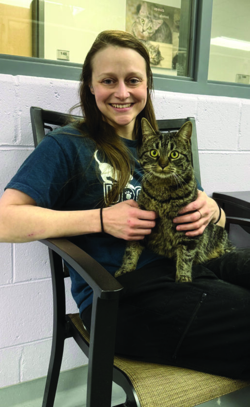 Laura Rochefort drove through the blizzard from West Ishpeming to care for the animals at UPAWS. Here she sits with one of the shelter’s cats. (Photo courtesy of UPAWS)