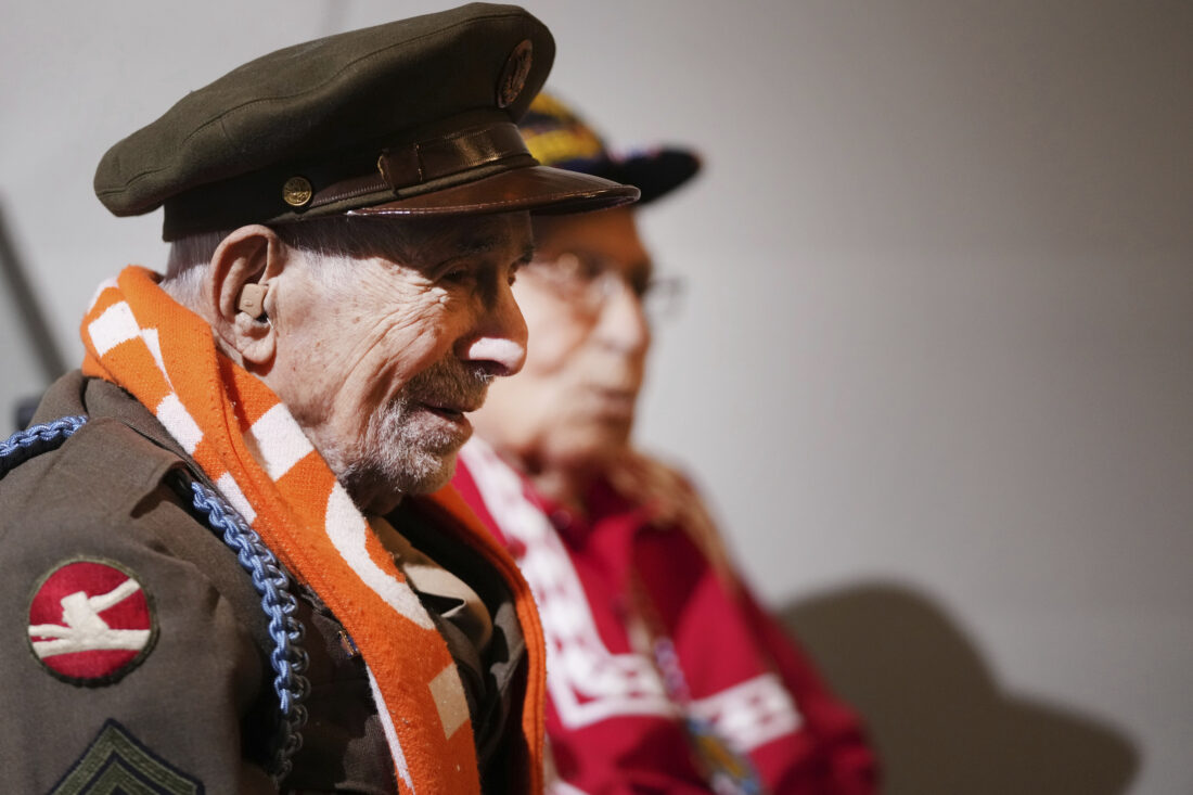 WWII veterans, Gilbert Charleston, Choctaw Nation Elder, 739th Tank Battalion, from Oklahoma, right, and David Marshall, US Army 84th Infantry Division, from New York, speak with journalists during the 80th commemoration of the Battle of the Bulge in Bastogne, Belgium, Friday. (AP photo)