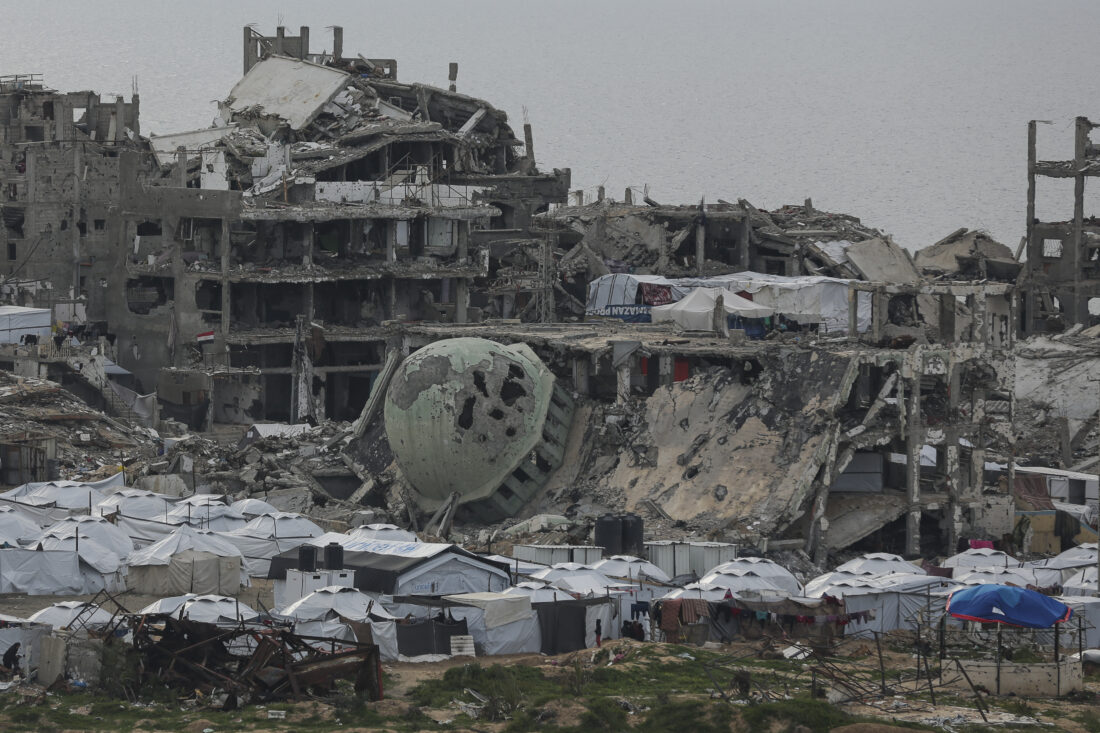 A tent camp for displaced Palestinians is set up amid destroyed buildings in the west of Al-Shati camp, west of Gaza City, on Monday, March 3, 2025. (AP Photo/Jehad Alshrafi)