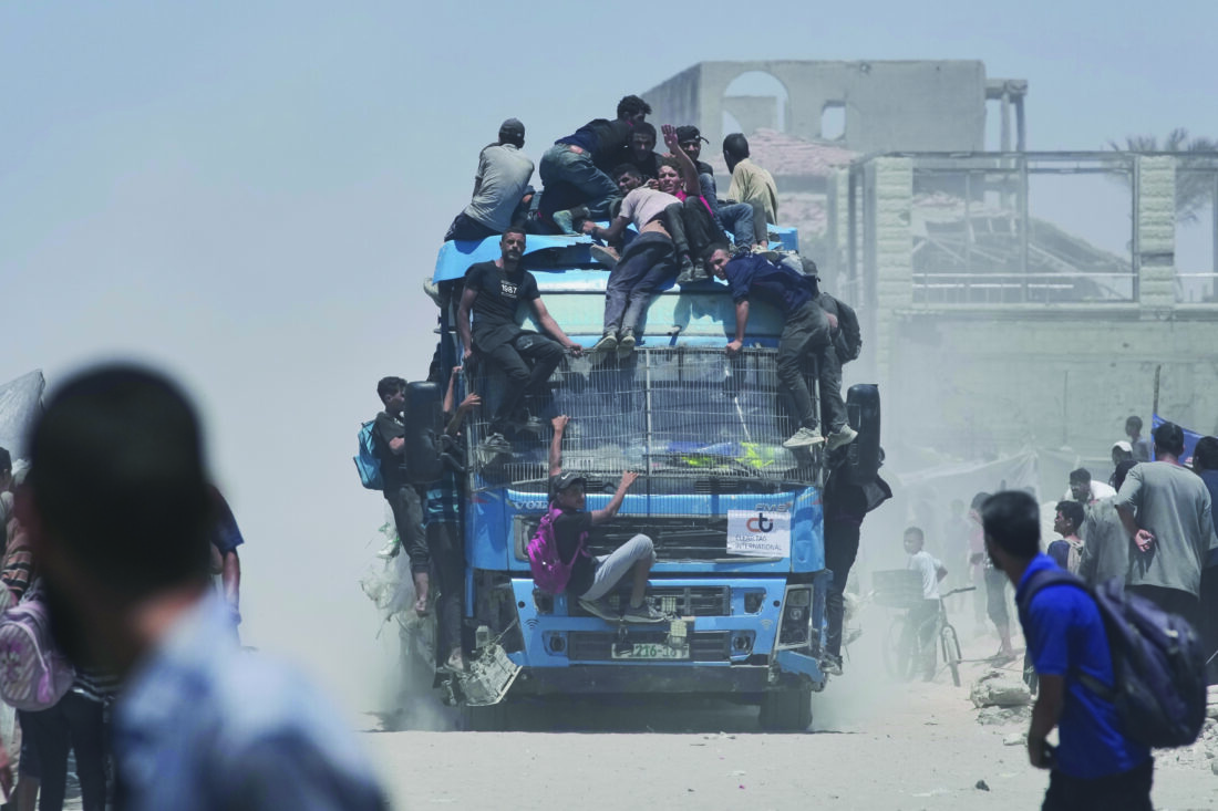 Palestinians hold onto an aid truck returning to Gaza City from the northern Gaza Strip on Tuesday. (AP photo)