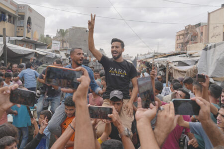 Palestinians celebrate following the announcement that Israel and Hamas have agreed to the first phase of a peace plan to pause the fighting, in Khan Younis, southern Gaza Strip, Thursday. Celebrations remain limited, as relief is mixed with mourning and concern for what comes next. (AP photo)