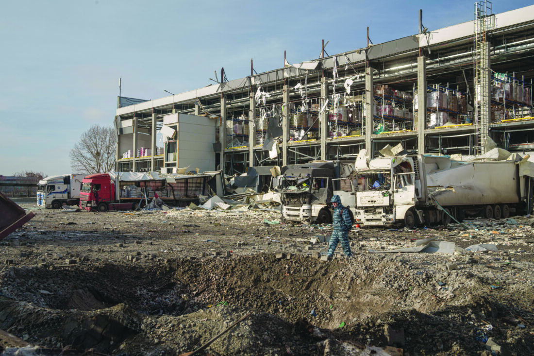 A security guard looks at a crater in front of a Novus logistics center damaged after a Russian strike on Kyiv, Ukraine, on Tuesday. (AP photo)