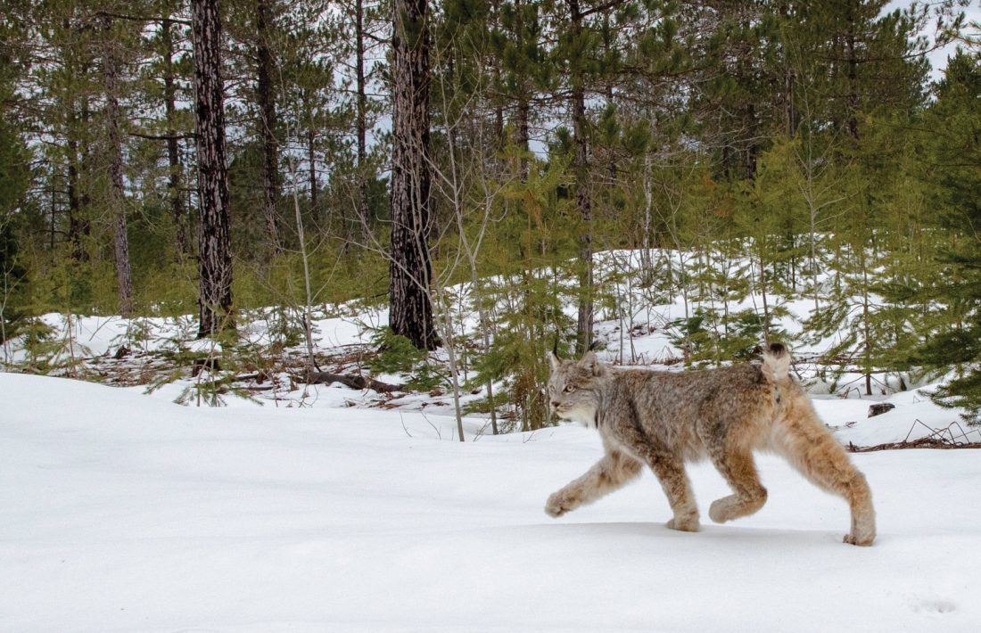 - A female Canada lynx walks free into the afternoon air April 12, 2019, in Schoolcraft County. (Photo courtesy of Michigan Department of Natural Resources)