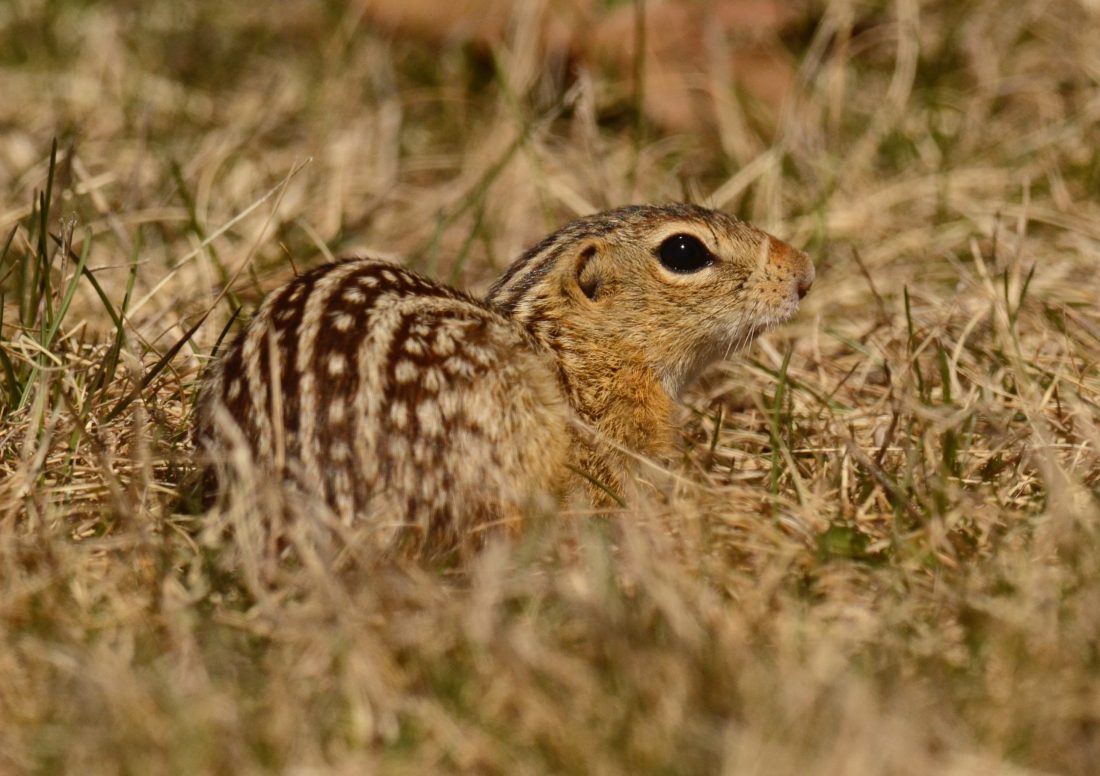 They are cute little furballs. As their common name indicated, they have rows of tan and dark brown lines across their backs, the darker lines punctuated with rows of light dots. Like their larger rodent relatives, the prairie dogs, they frequently grab a paw/handful of grass blades or a bunch of clover and sit on their haunches to eat it, raising their heads slightly above the line of vegetation to watch for danger. They are probably at their best when collecting vegetation to line their burrows. Filling their mouths with large bunches of grass they offer a whiskered look, just a bit like those chipmunks with cheek pouches full of seeds. Ever curious, they will peek out of their burrows frequently after being frightened, and it is that wondering mind that probably gets them in the most trouble.