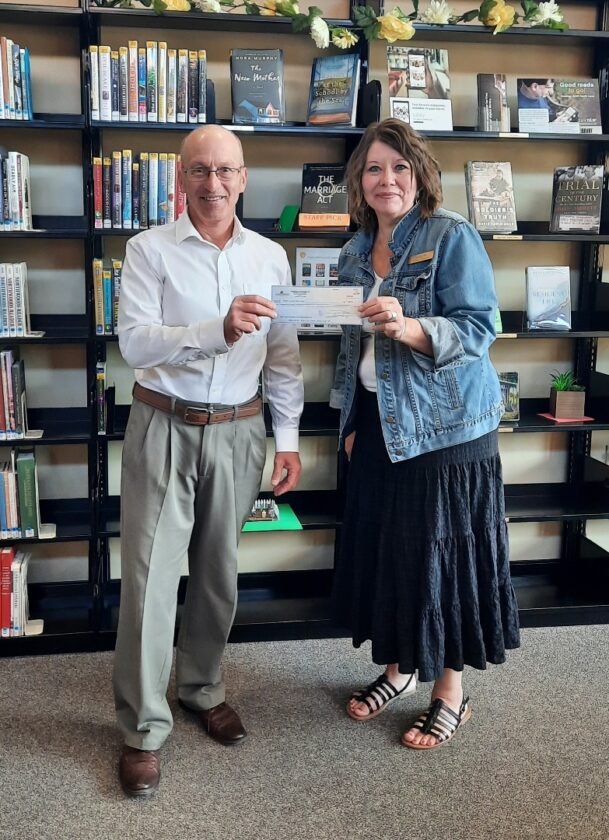 Gwinn Area Community Fund Board Chair John Maki presents a grant from the Community Foundation of Marquette to Forsyth Township Public Library Director Leslie Makela for the 50th Anniversary Novel Destinations Summer Reading Program. The library is one of many recipients receiving foundation grants this year. (Photo courtesy of CFM)