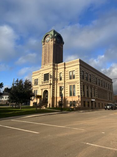 Negaunee’s two-story city hall has several defining features. One of the most prominent is its 94-foot-tall clock tower which sits atop alternating layers of light and dark brick.