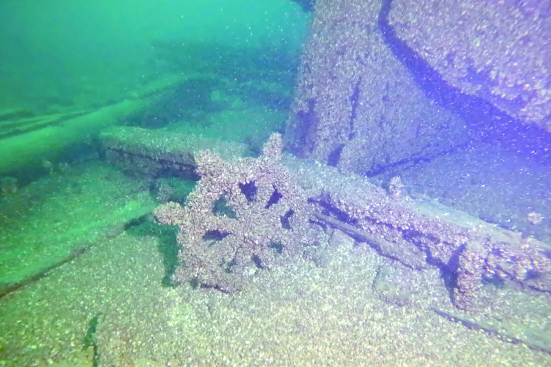 In this photo released by the Wisconsin Historical Society, the wheel of the F.J. King shipwreck is seen in Lake Michigan on Aug. 23, 2025. (Wisconsin Historical Society via AP)