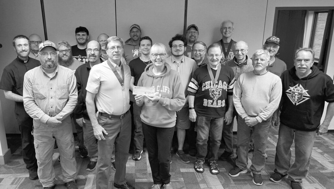 The St. Michael's Knight of Columbus council recently presented Bay Cliff Health Camp with a check from a recent fundraiser to help the facility continue its incredible work with special-needs campers. Thanks to the generosity of the greater Marquette area for giving to the Knights of Columbus, during their fundraising efforts (like their Tootsie Rolls hand-out and recycling efforts) the council was able to present a generous donation of over $1,100 to Bay Cliff Health Camp. Dr. Lutgen received the check and shared examples of how the health camp gives impaired children therapy and great memories. Shown is the Father Jacques Marquette Council No. 17772. Pictured, from left, are Father Dustin Larson, Dennis Maki, Matt Surrell, Mario Scibelli, Michael Mankee, Mike Perucco, Chuck Pemble, Grand Knight Rob Noel, Patrick Markey, Matthew Jenkins, the executive director of Bay Cliff Health Camp Dr. Claire Lutgen, Isaac Pifer, Andy Ylkanen, Steve Lawry, district deputy Charles Crotty, Jerry Tredeau, Gordy LeDuc, Terry Gustafson, Tom Ogle, Tom Taylor. (Photo courtesy of Dan Boyle)