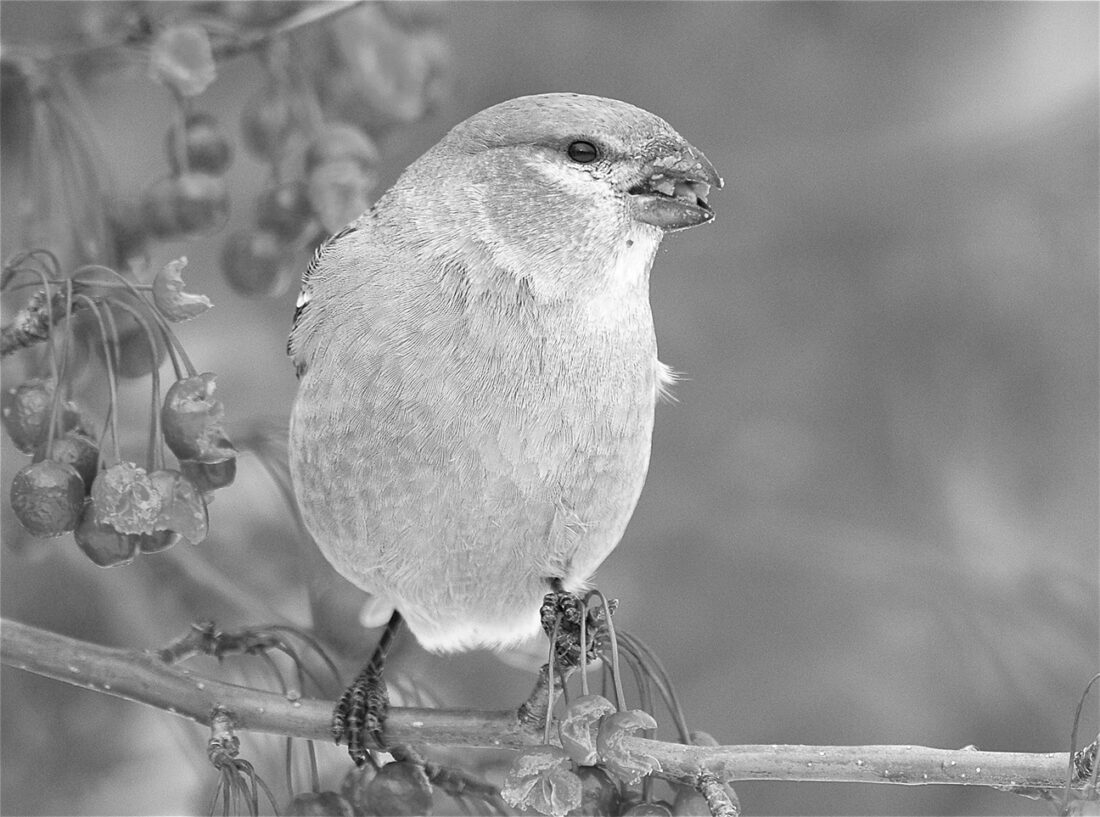 A female pine grosbeak is seen. (Scot Stewart photo)