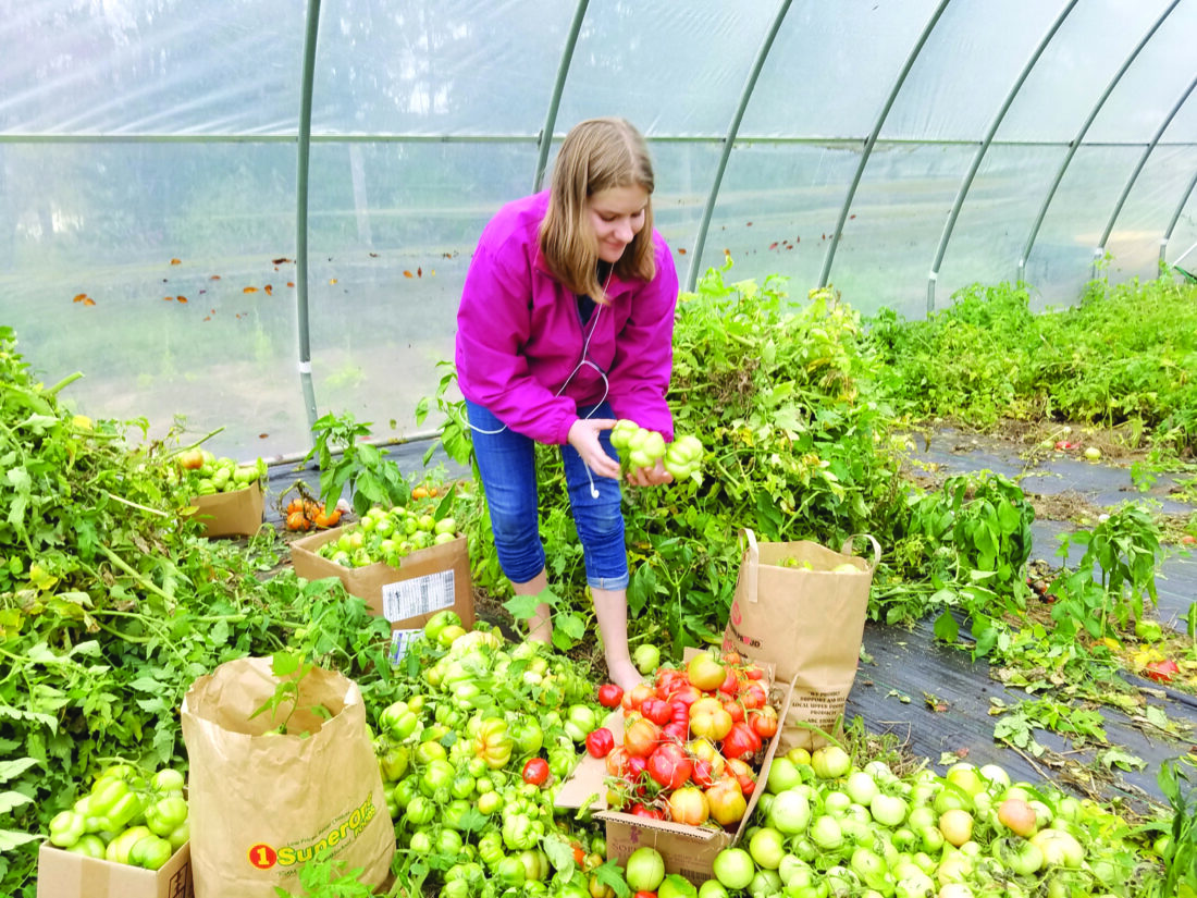 A Partridge Creek Farm volunteer harvests tomatoes at the Partridge Creek West hoop house. (Photo courtesy of Partridge Creek Farm)